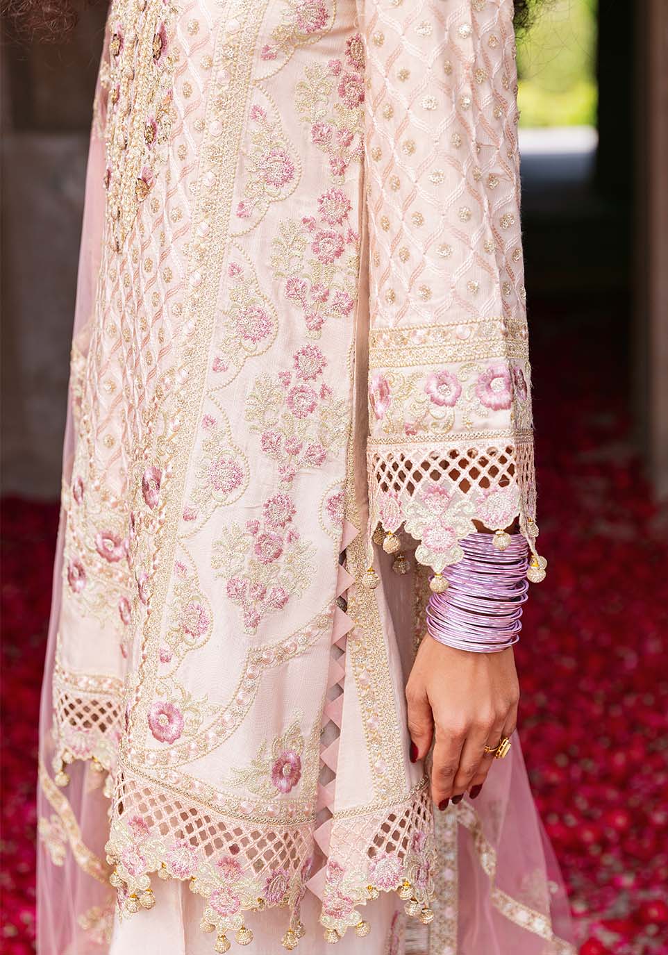 Awash in the tender hues of nude peach and blush pink, Bahār blossoms with the quiet poetry of spring. The raw silk kurta shimmers with sequins embroidery and a hand-embellished neckline, while intricate cutwork borders trace the daman and sleeves with artisanal delicacy. A blush pink net dupatta edged with cutwork embroidery adds a touch of romantic contrast, flowing effortlessly over sequined raw silk farshi shalwar. Bahār embodies grace reborn — a soft symphony of light, craftsmanship, and renewal.