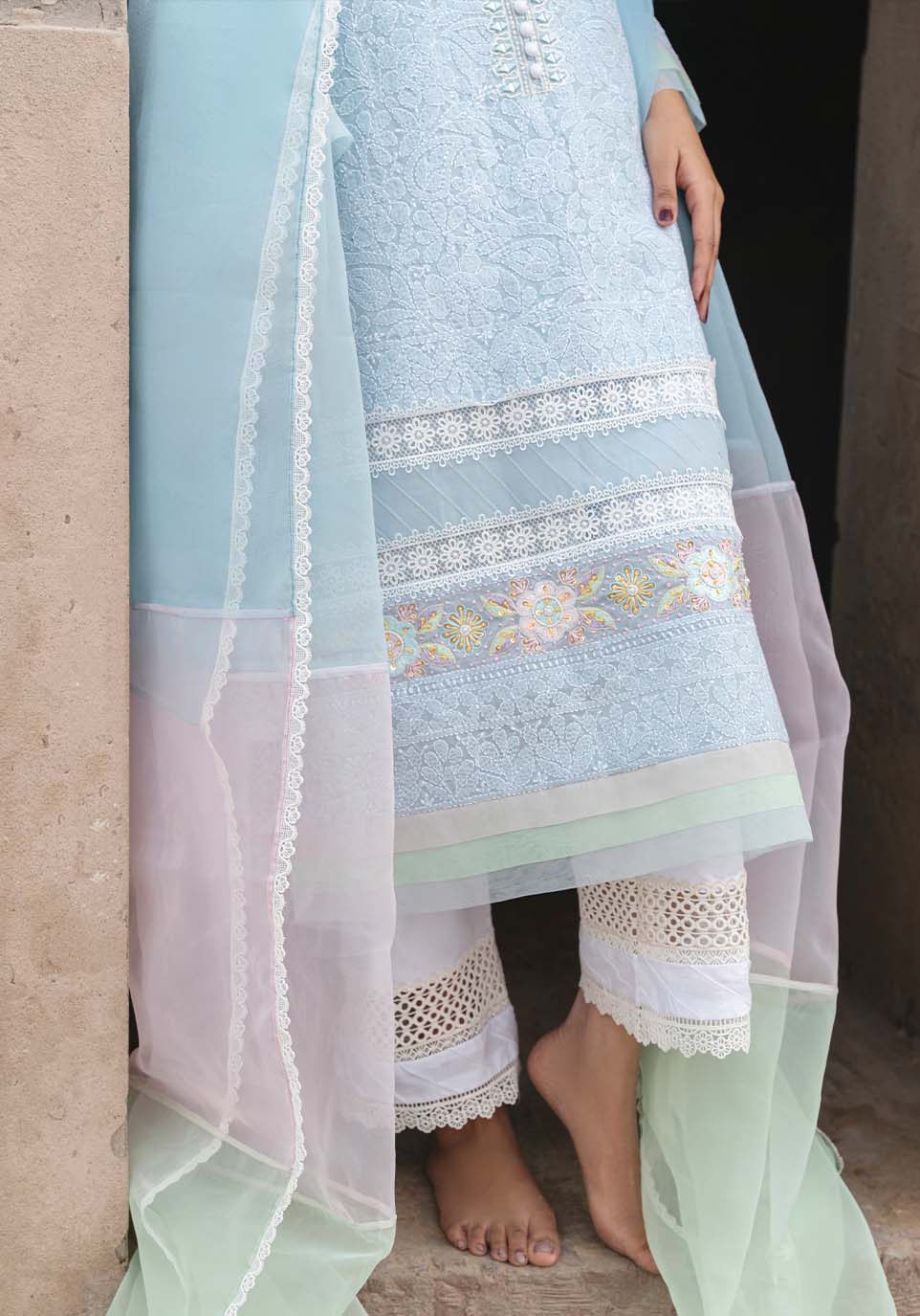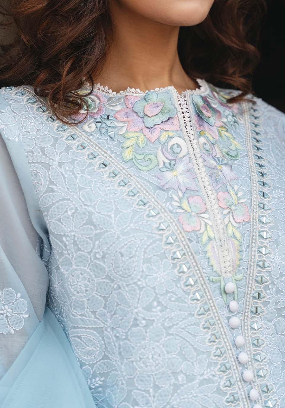 In filtered daylight, where shadow and bloom coexist in quiet harmony, Aab-e-Raunaq unfolds in composed brilliance. Powder blue chikankari forms a disciplined foundation, while mirror articulation and multi-floral embroidery introduce measured luminosity across the neckline and surface. Each reflective detail is placed with restraint, allowing light to gather rather than scatter.