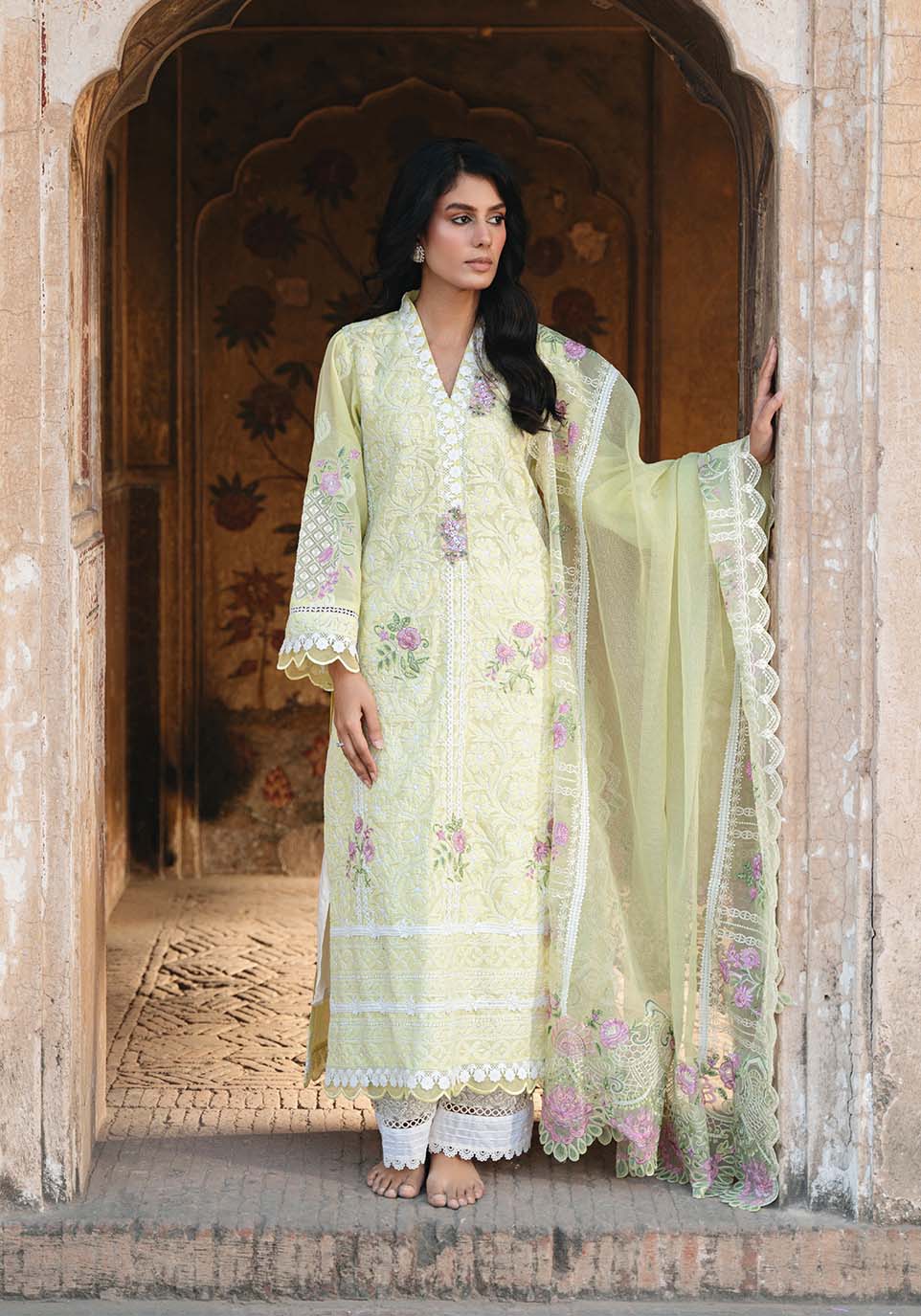 Within the quiet shelter of arches, Gulnaar-e-Baagh unfolds with softened grace. Pistachio chikankari forms the disciplined base, while floral accents emerge like blossoms against spring air — deliberate yet expressive. Lace-trimmed borders introduce delicacy, allowing texture to breathe.