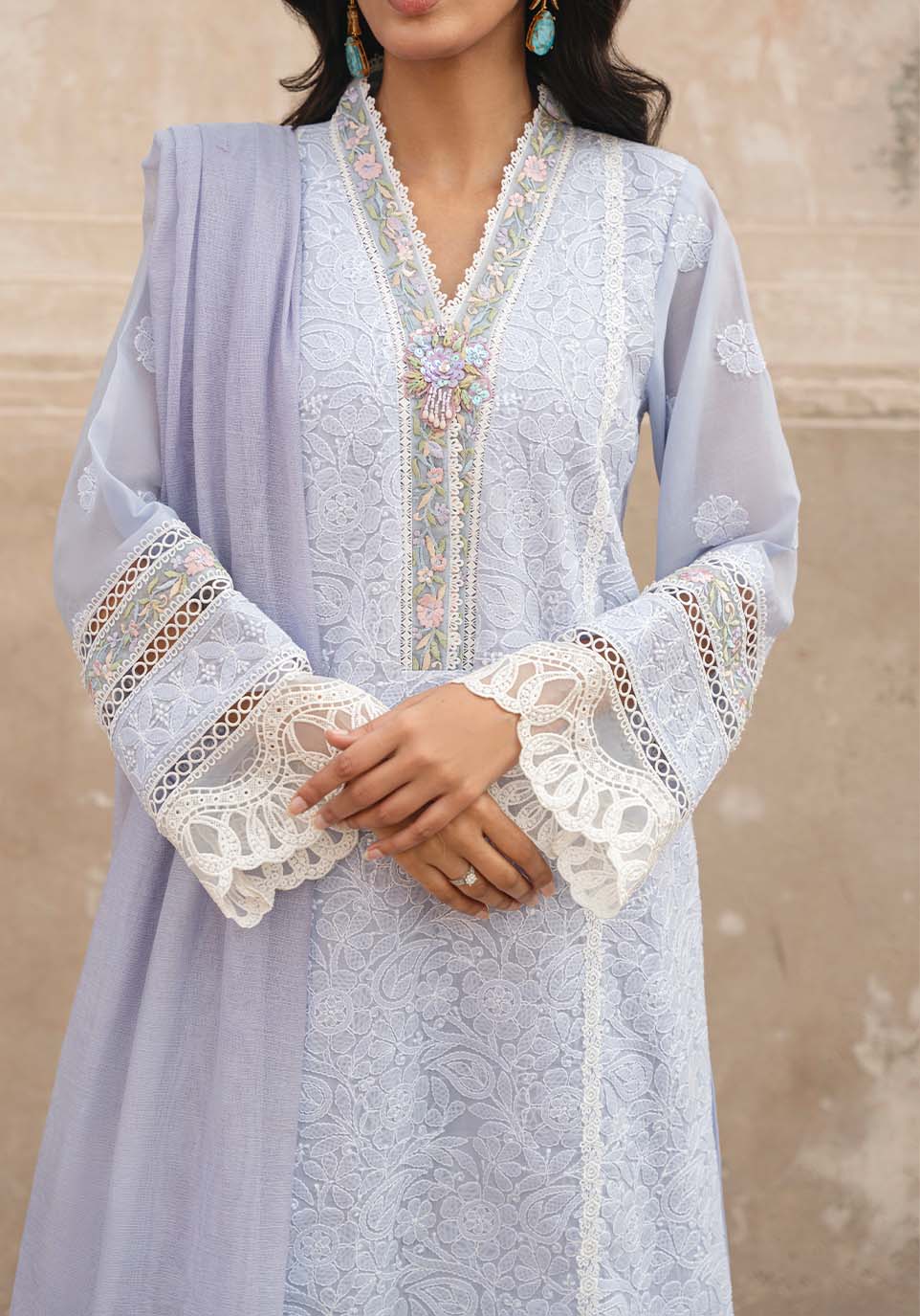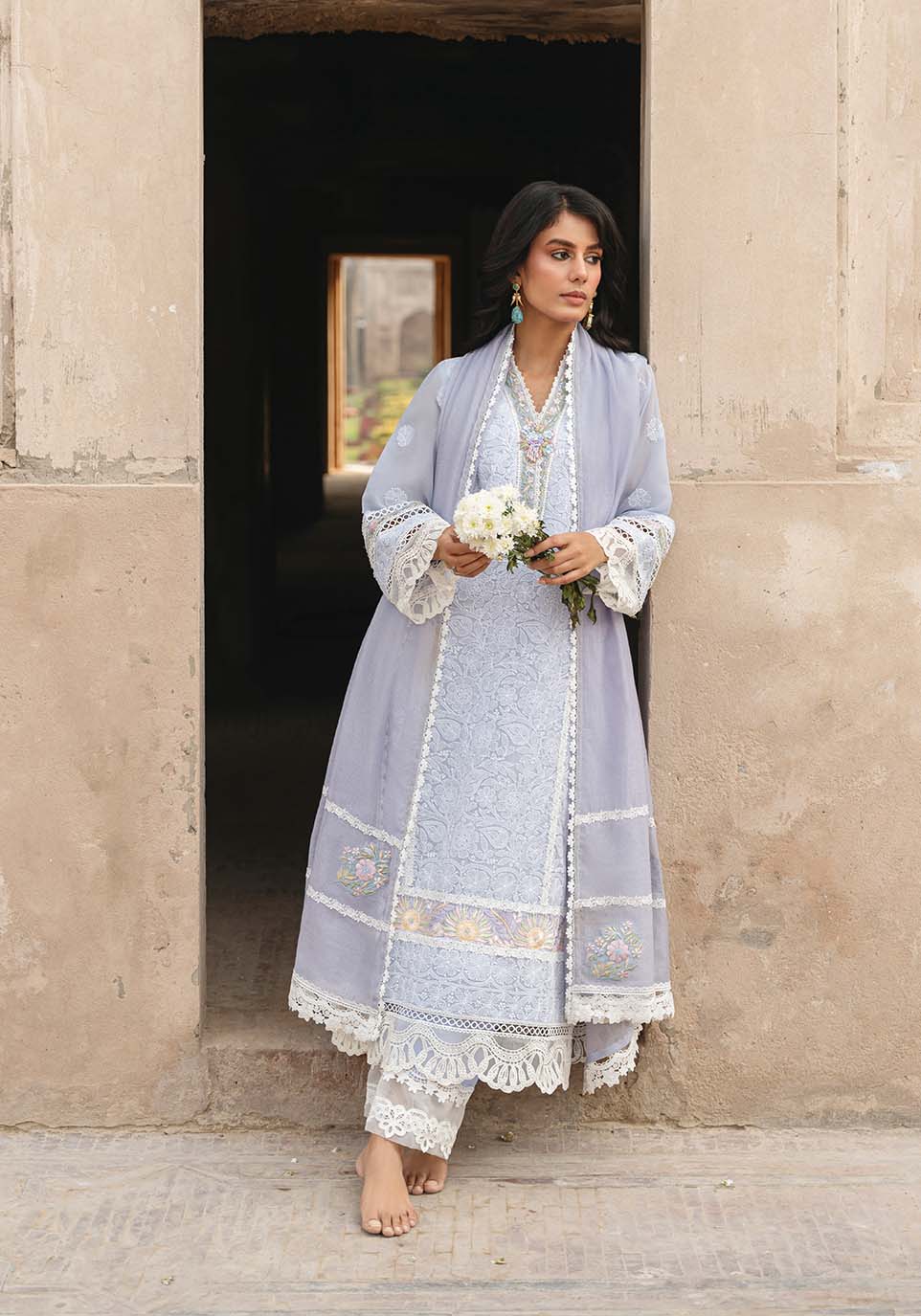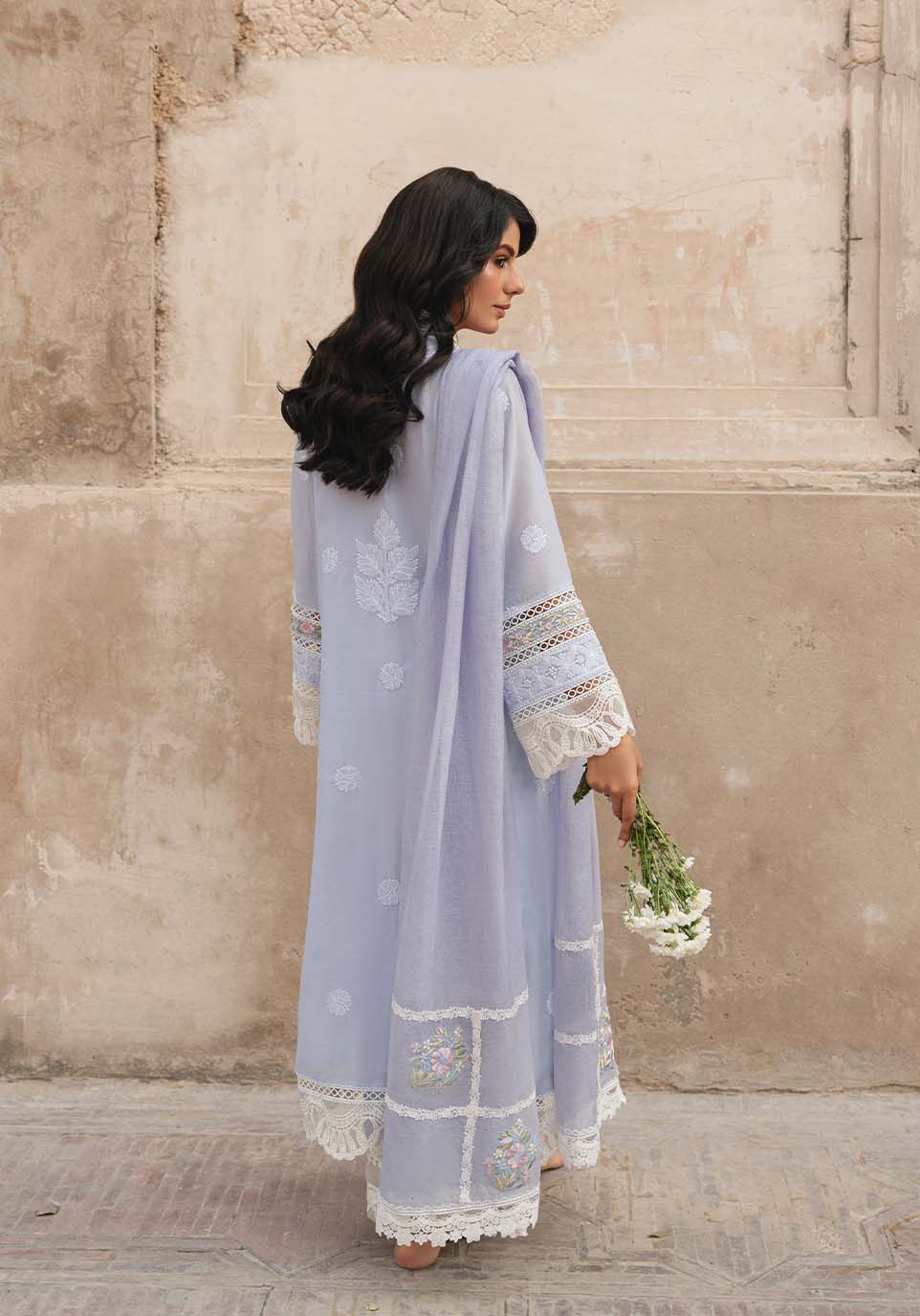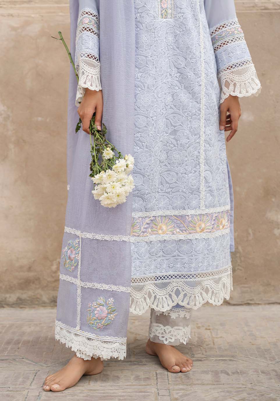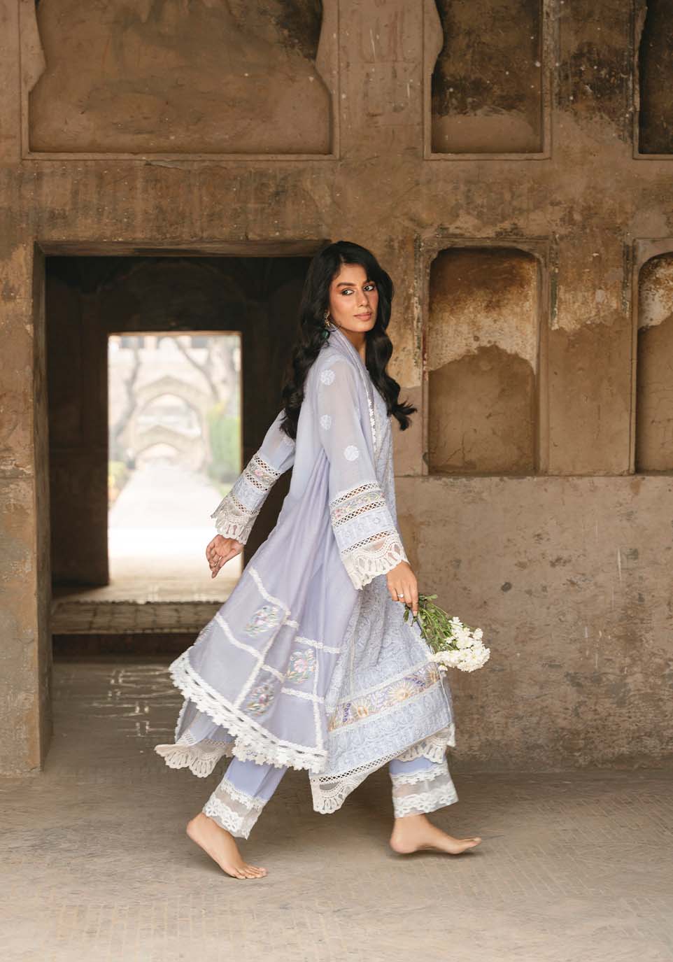 In the hush between dusk and nightfall, when violet shadows settle against stone, Lailum emerges in softened grace. Lavender chikankari, articulated with delicate threadwork, forms a luminous base, while layered borders and pastel accents introduce a quiet narrative without disrupting balance. The surface remains refined, allowing texture to unfold with measured restraint.