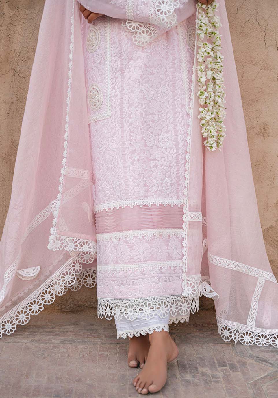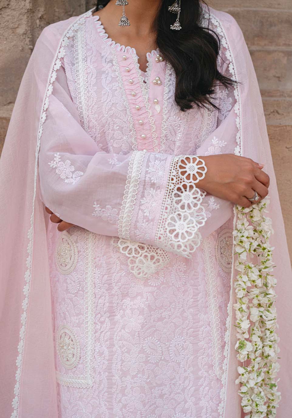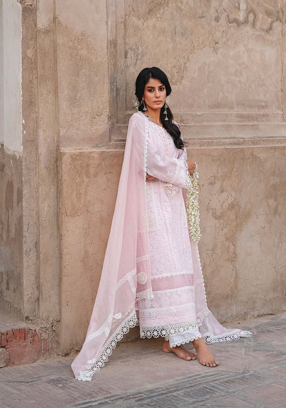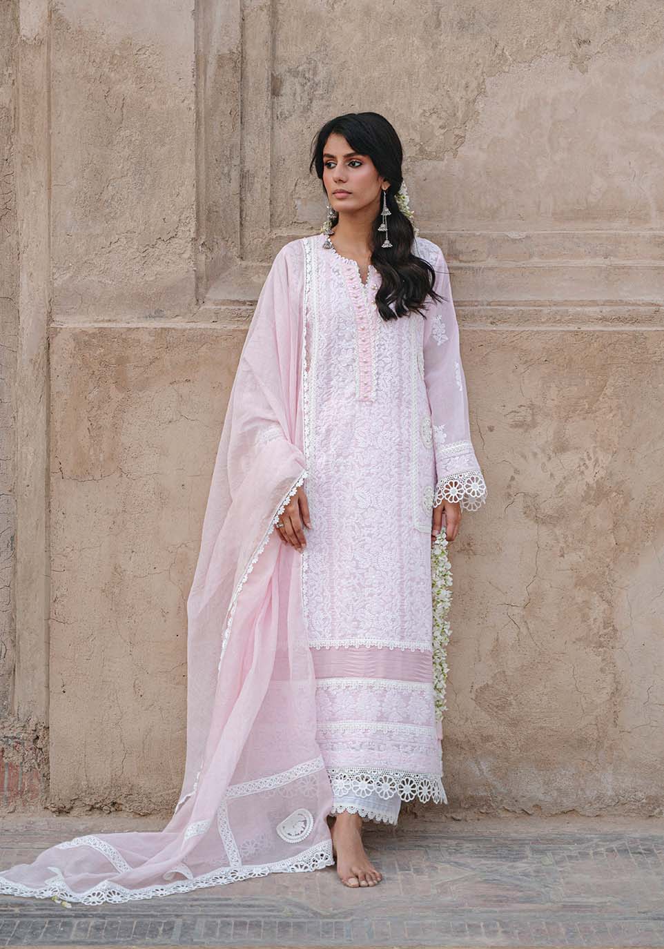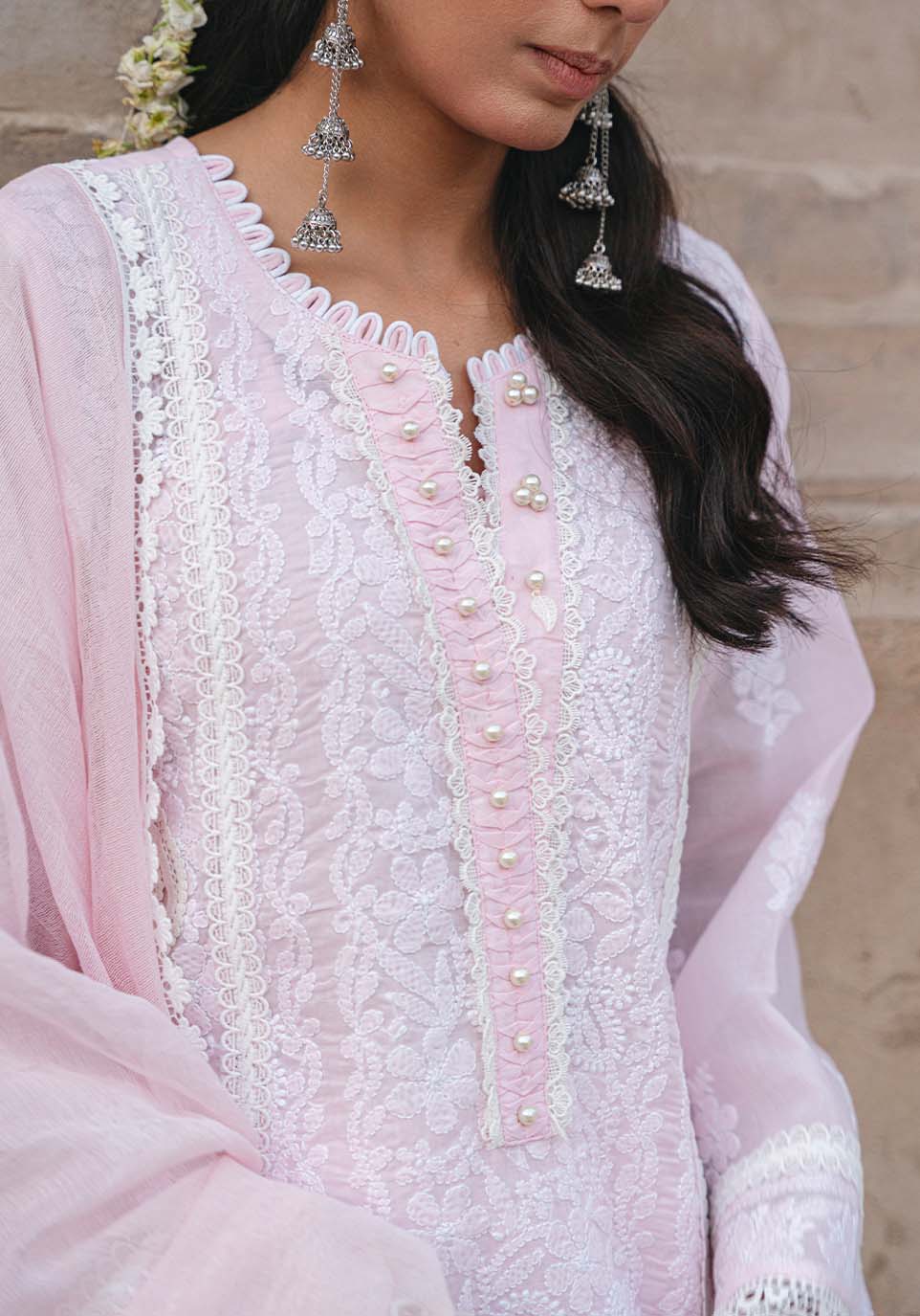 In the softened glow of early dusk, where rose light settles against stone, Mahpara unfolds in measured grace. Blush chikankari articulated through fine tonal embroidery reveals clarity within delicacy, each motif placed with deliberate restraint. Borders resolve with quiet precision, allowing softness to exist within structure. The silhouette remains elongated and assured, preserving proportion without ornament. This is cultivated femininity — luminosity refined through lineage. Mahpara endures as elegance shaped by discipline.