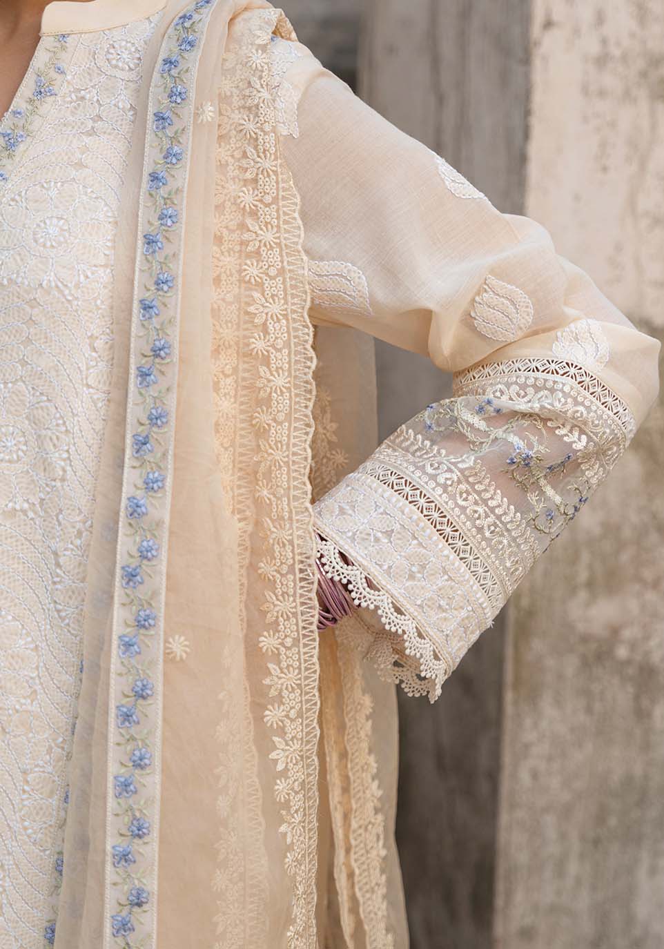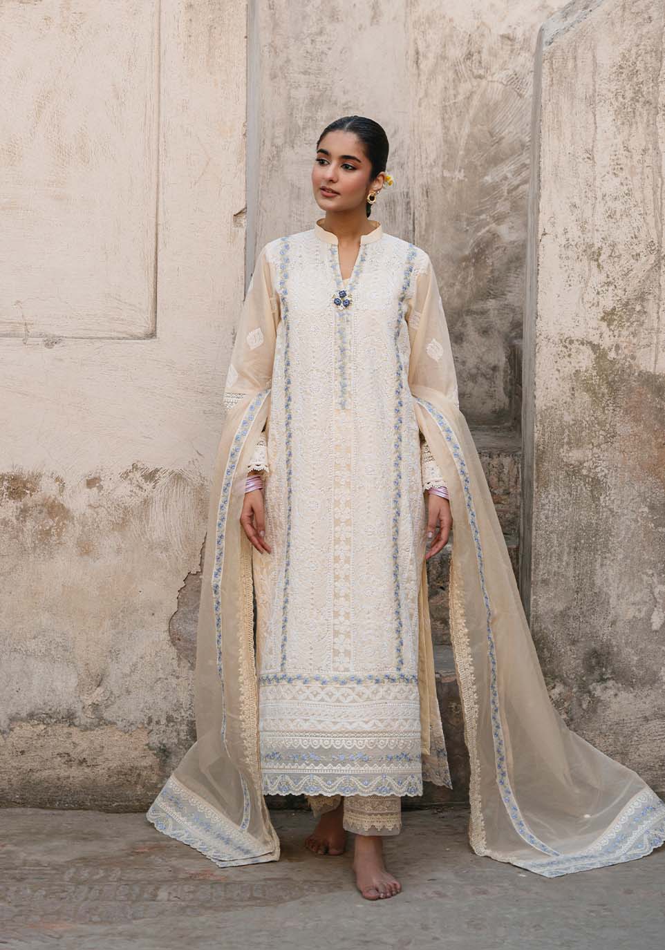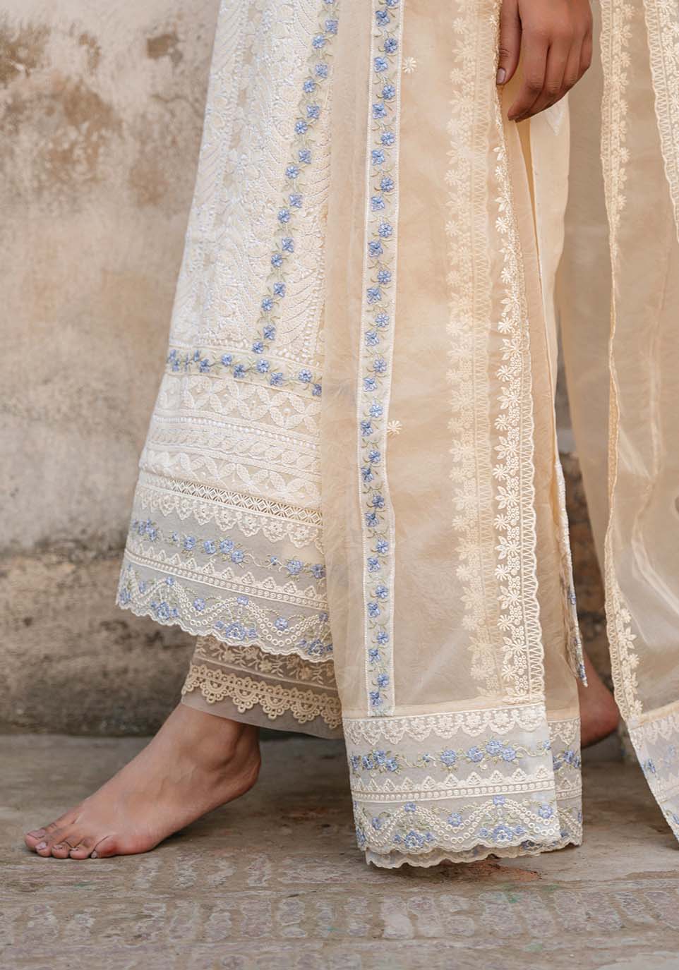 In the first hush of dawn, when sandstone walls absorb the light of morning, Sahar-e-Awadh rises in quiet distinction. Warm ivory chikankari articulated with slender blue accents introduces measured contrast, each line guiding the eye with deliberate restraint. The embroidery remains refined and architectural, allowing clarity to lead the composition.