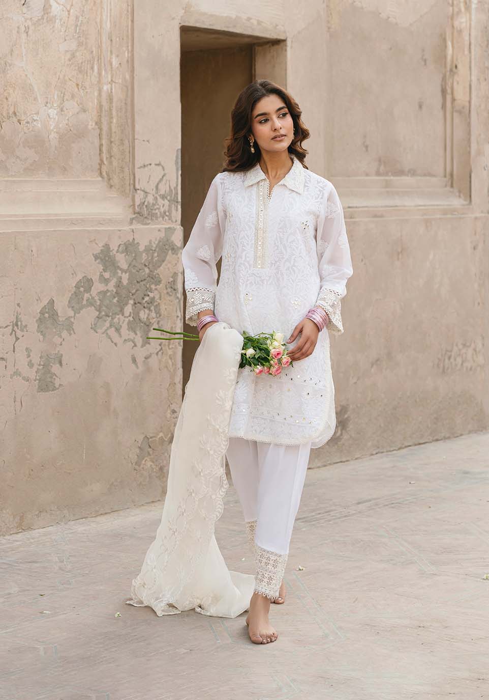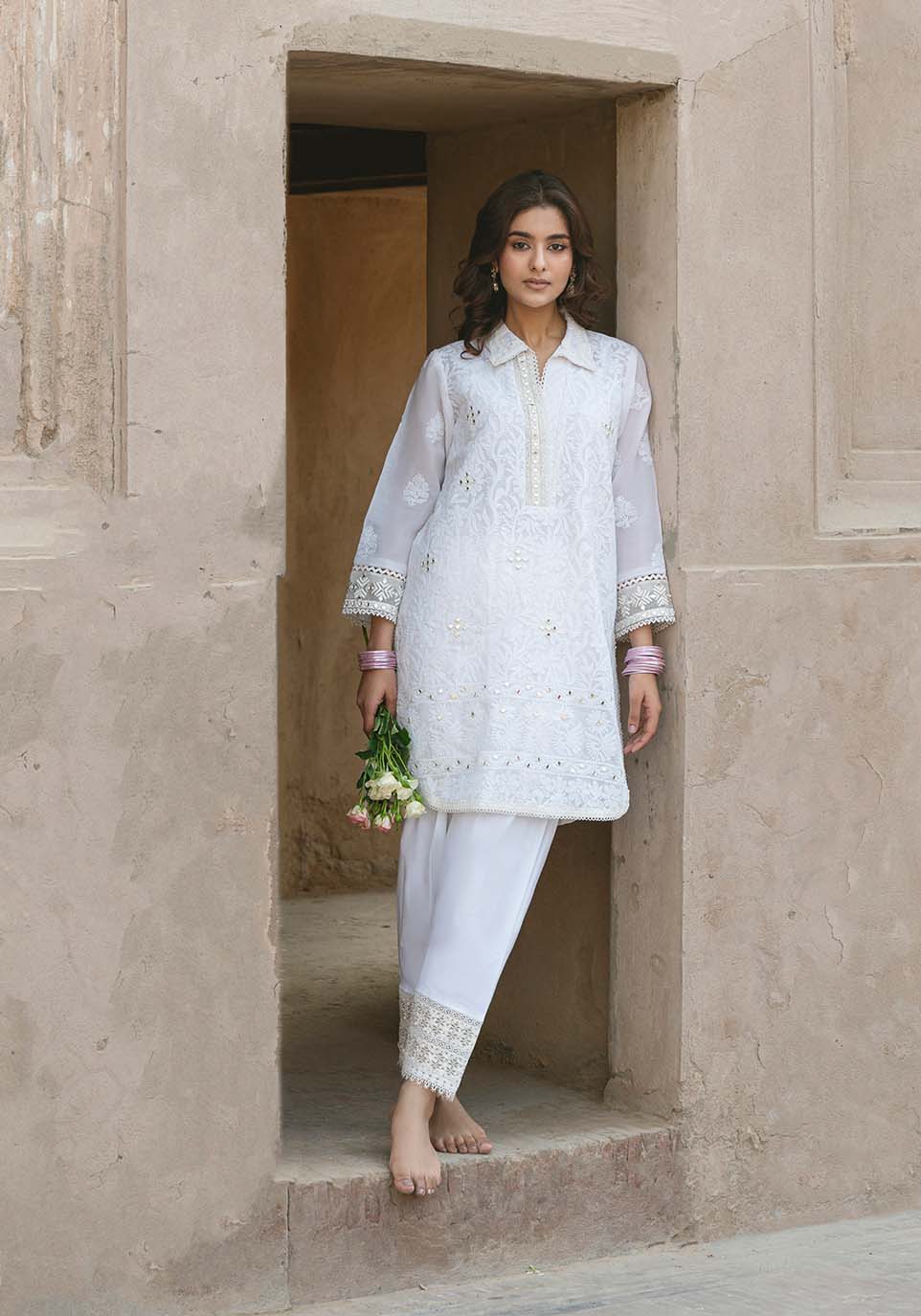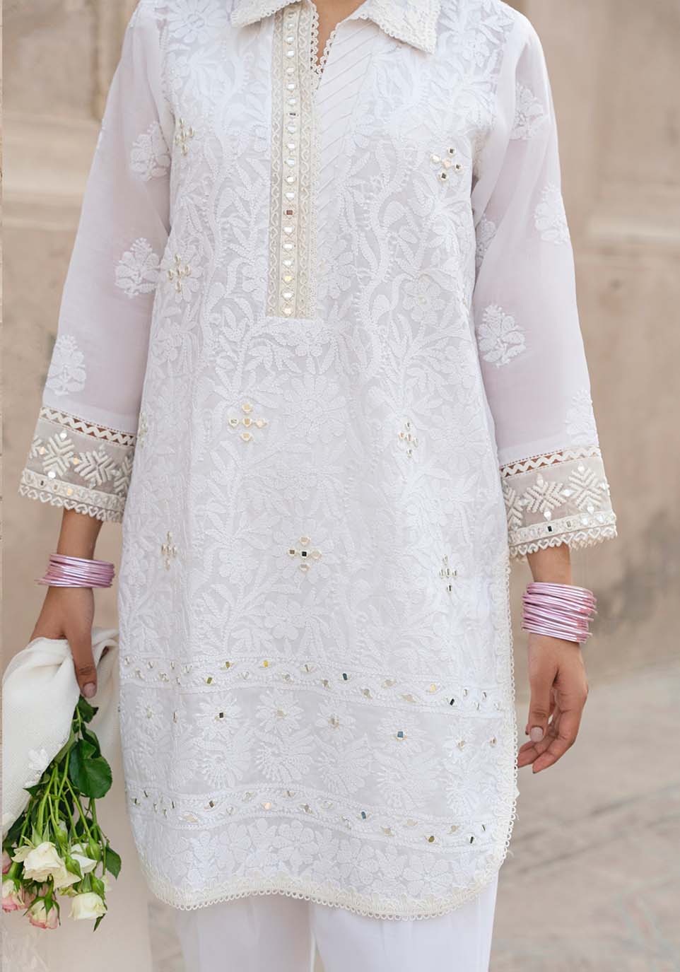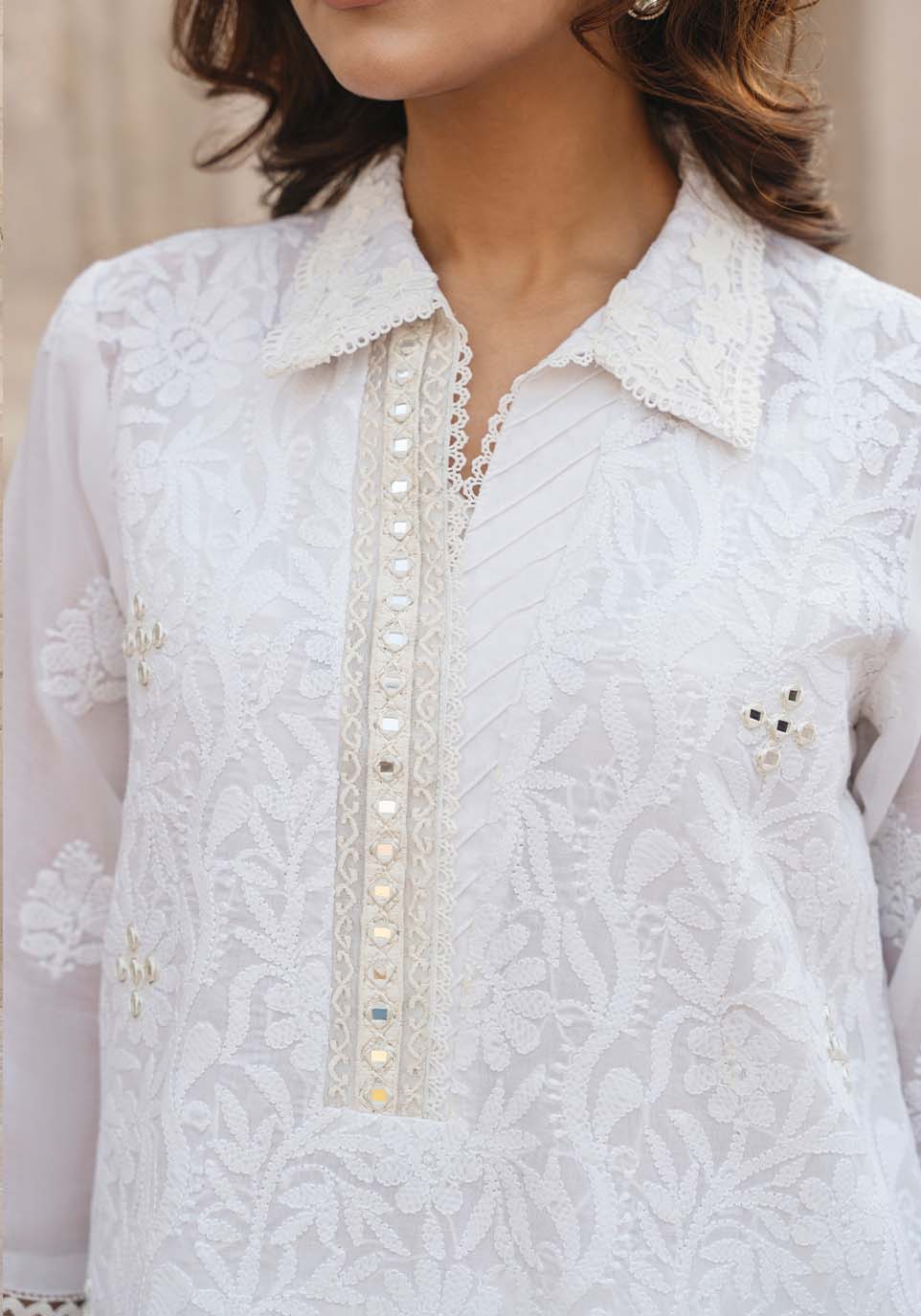 In the gentle quiet of open courtyards, Shehrbano unfolds in measured purity. White chikankari articulated with disciplined threadwork forms a luminous base, while delicate mirror accents glimmer softly across the surface — restrained, intentional, never ornamental.
