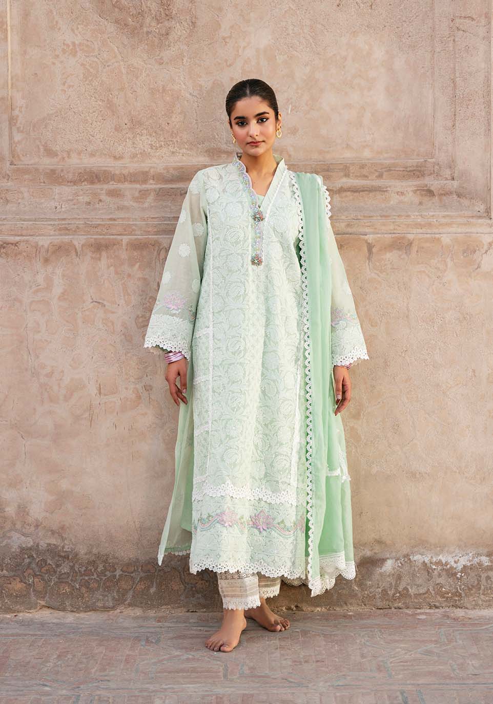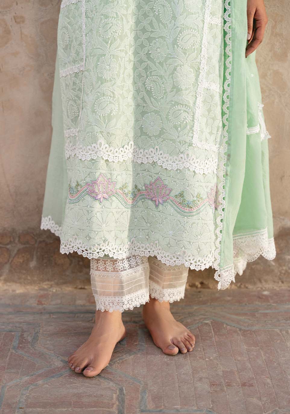 In the calm breath of shaded courtyards, Zehra-e-Nawab emerges in composed freshness. Mint chikankari rendered in balanced threadwork builds depth through order rather than density, allowing surface and negative space to coexist in harmony. Borders conclude with clarity, reinforcing structure without excess. The silhouette flows with intention, poised yet fluid. This is renewal governed by craft — refinement carried with quiet authority. Zehra-e-Nawab reflects serenity shaped by heritage.