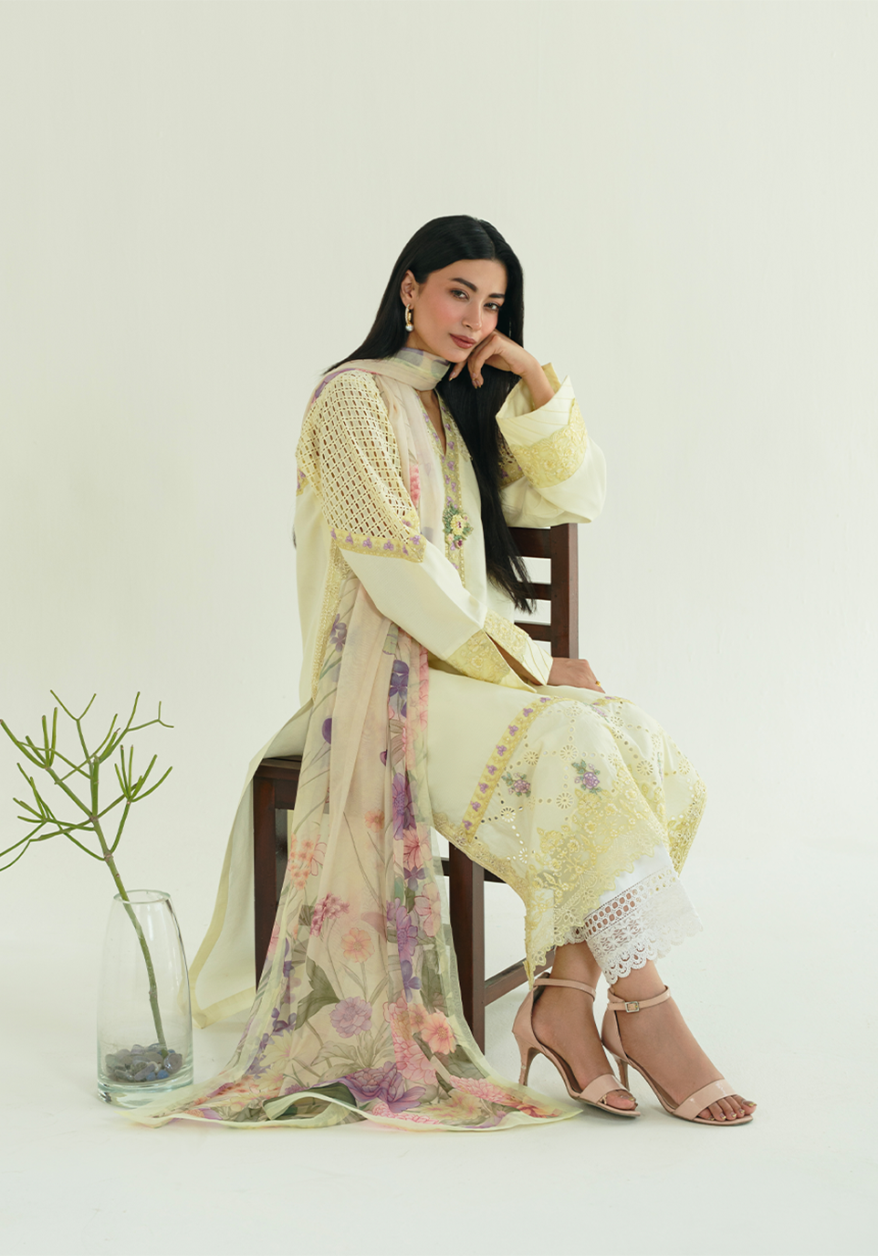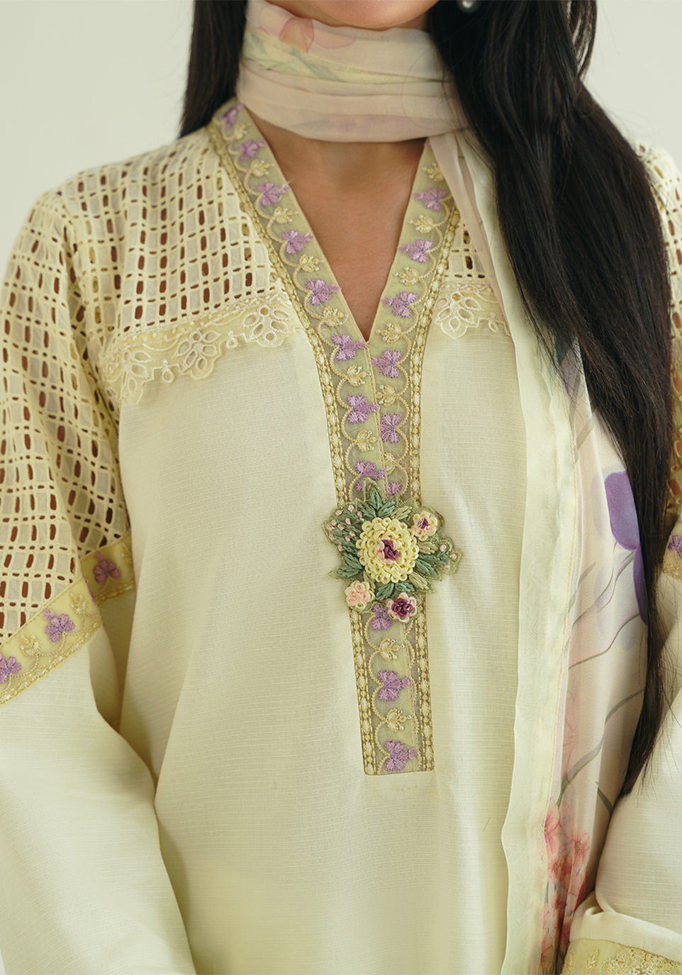 A soft serenade in butter yellow, this self-textured lawn kurta is gracefully intertwined with delicate eyelet fabric. The front is adorned with intricately embroidered rosettes in romantic hues of lavender, lilac, and sage — lending a painterly charm to the piece. The silhouette is further elevated with tonal embroidery on the hem and cuffs, creating a harmonious blend of texture and detail. Paired with a dreamy digital-printed dupatta in soft florals and our signature ivory pants featuring intricate lace detailing, this look exudes timeless elegance with a fresh summer spirit. contrary to reality or truth with the intent to deceive