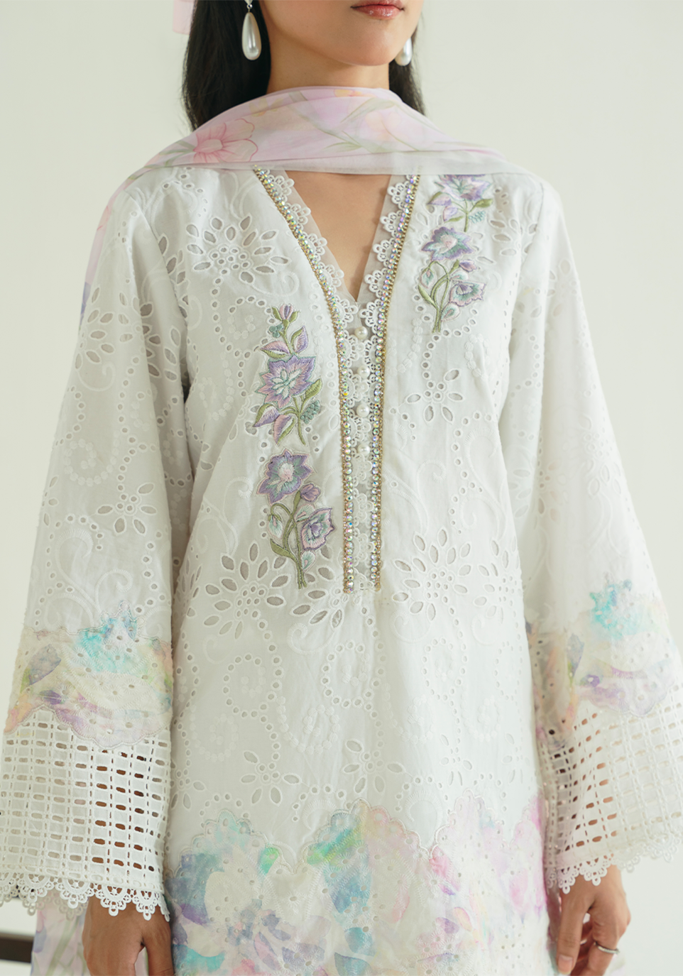 An ode to softness, this egg-white eyelet tunic is delicately intertwined with multicolored eyelet panels in hues of lilac, mint, and blush. Finished with intricate embroidery and lace detailing, the look exudes quiet charm and timeless elegance. Paired with signature wide-legged pants featuring dainty lace trims and completed with a digitally printed dupatta in watercolor florals, this 3-piece stitched ensemble is poetry in motion — serene, sophisticated, and effortlessly summery.