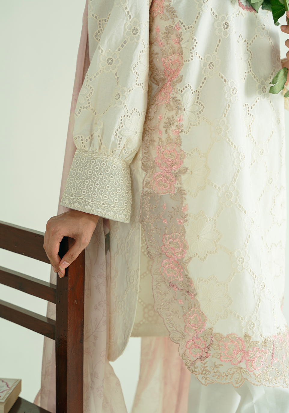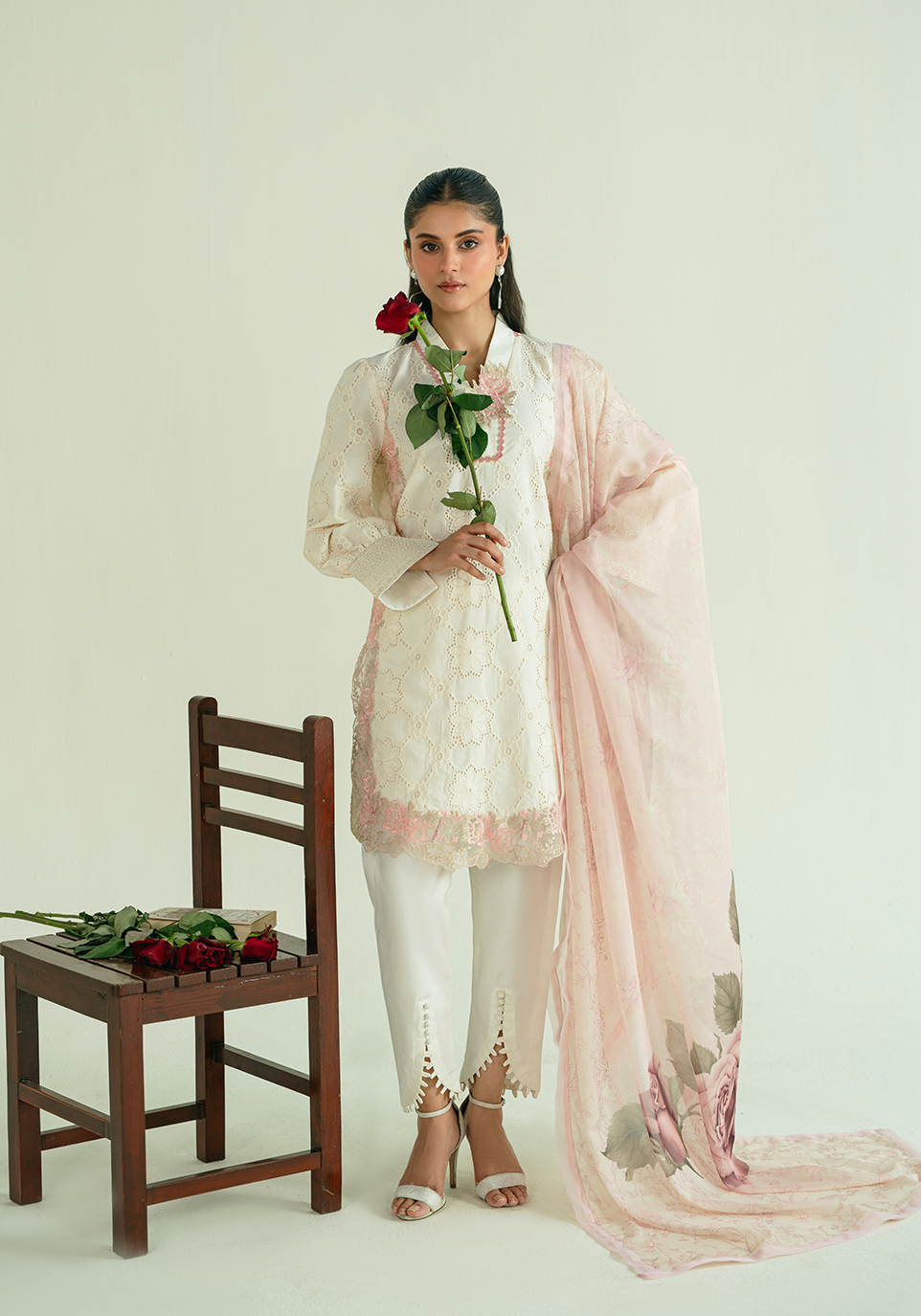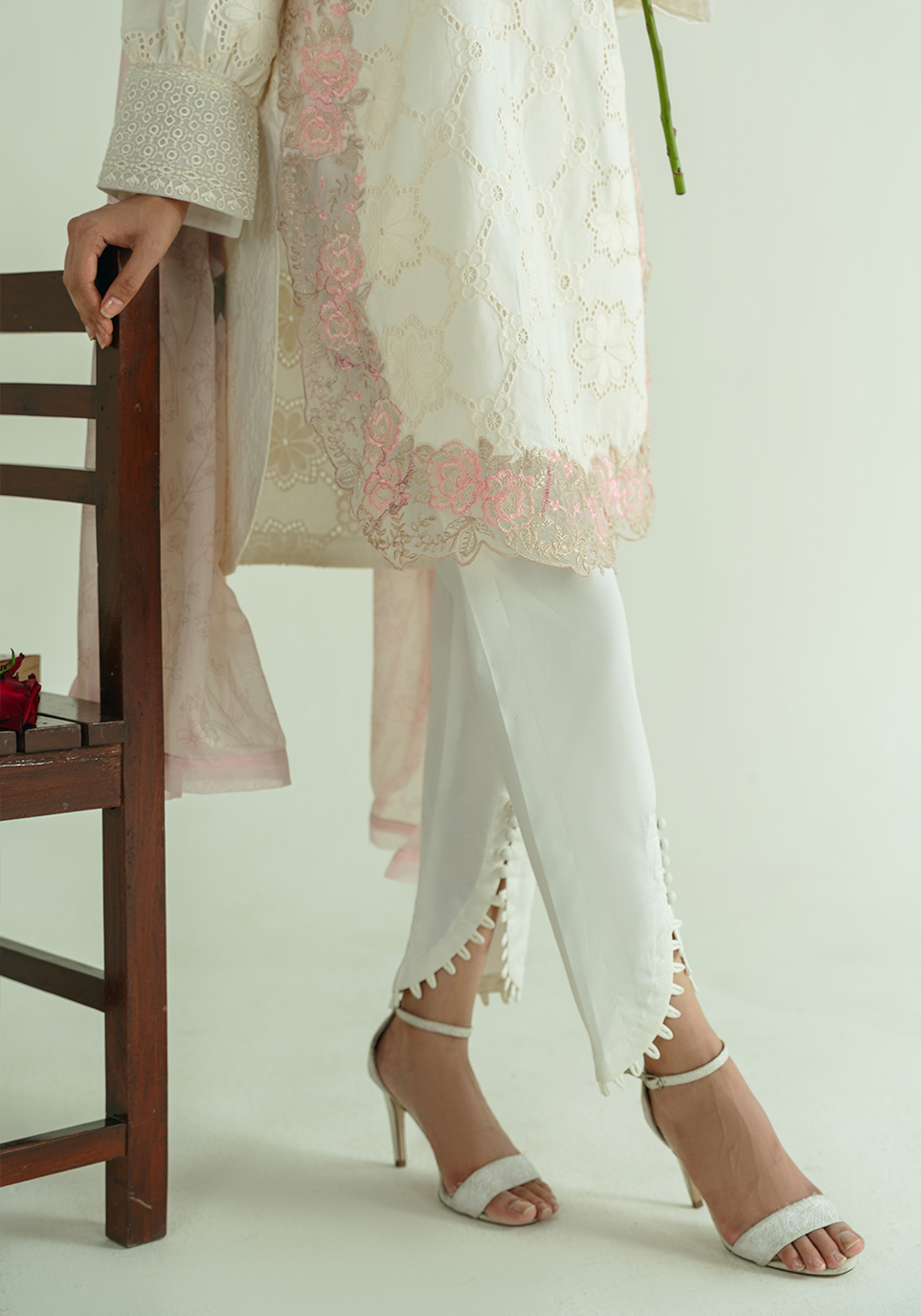 A vision of refined elegance, this ensemble is crafted from delicate eyelet fabric in a soft ivory hue. The kurta features intricate scalloped embroidery in blush pink along the neckline, hem, and sleeves — blending tradition with modern minimalism. Paired with tailored ivory pants accentuated with delicate cutwork and a sheer blush digital printed dupatta, this look is effortlessly graceful — perfect for serene summer soirées.