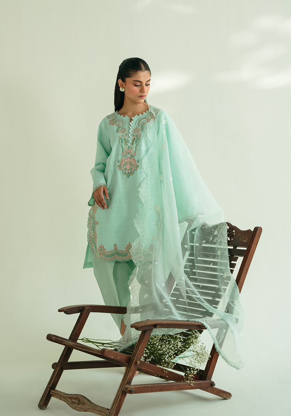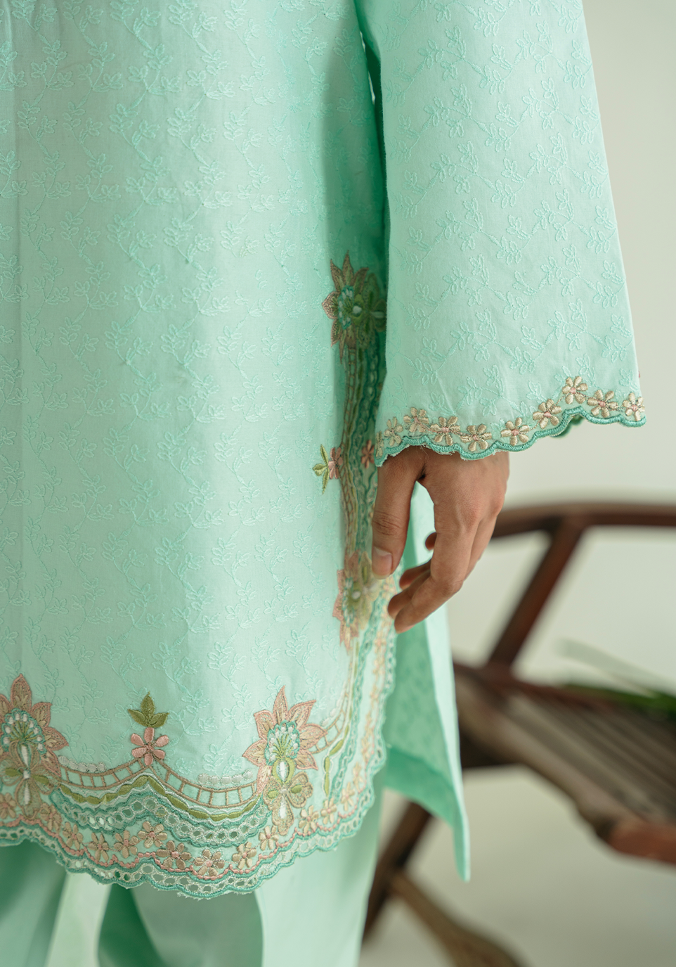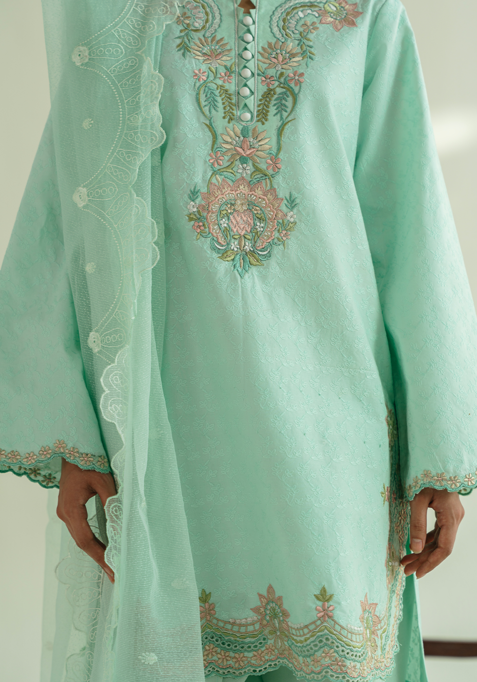 A vision of serene elegance, this ensemble is crafted from self-embroidered lawn in a refreshing mint hue. The kurta features a delicately rounded hemline and is adorned with intricate multicolored embroidery that dances across the neckline, hem, and sleeves—infusing the piece with timeless charm. Paired with matching tulip pants that add a modern flair and an ethereal cotton net dupatta embroidered with floral motifs, this look strikes a graceful balance between tradition and contemporary finesse. Ideal for sunlit summer soirées or festive daywear.