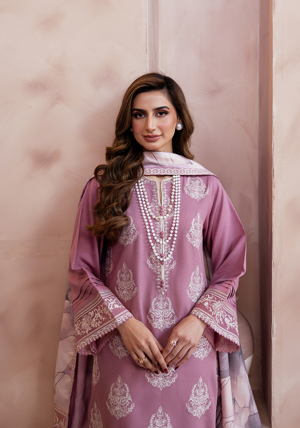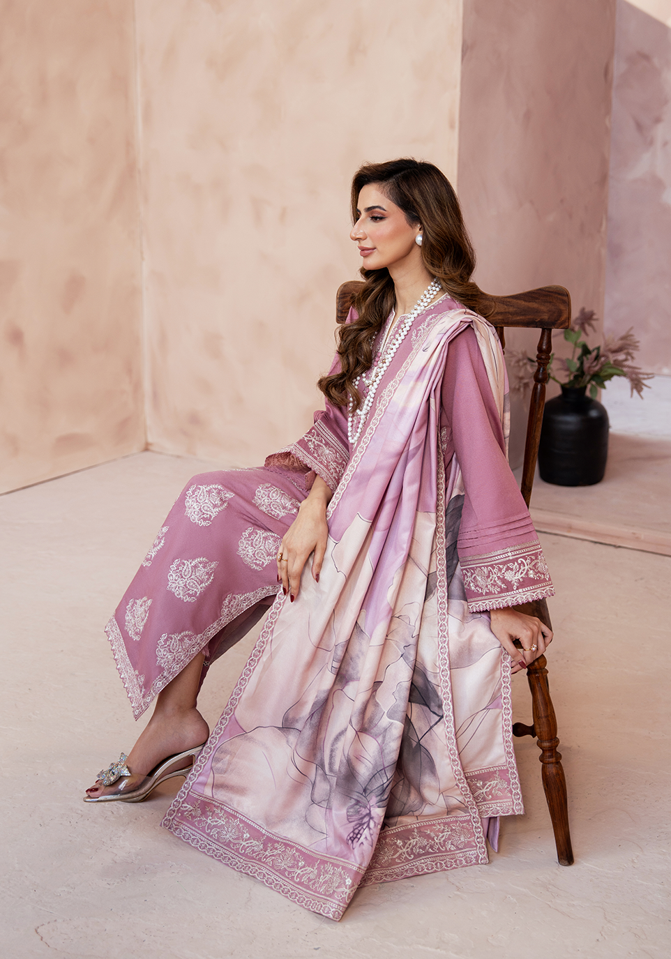 A charm-pink winter karandi ensemble that blends feminine grace with artisanal craftsmanship. The outfit is elevated with ivory Kashmiri-inspired embroidery across the front, sleeves, hem, and a refined motif at the back. Soft pleated sleeves add gentle structure to the silhouette, while matching embroidered pants ensure a seamless look.Styled with a digital printed shawl bordered with embroidery, Blush Heritage delivers the perfect balance of warmth, texture, and elegance  ideal for winter occasions, festive lunches, and seasonal soirées.