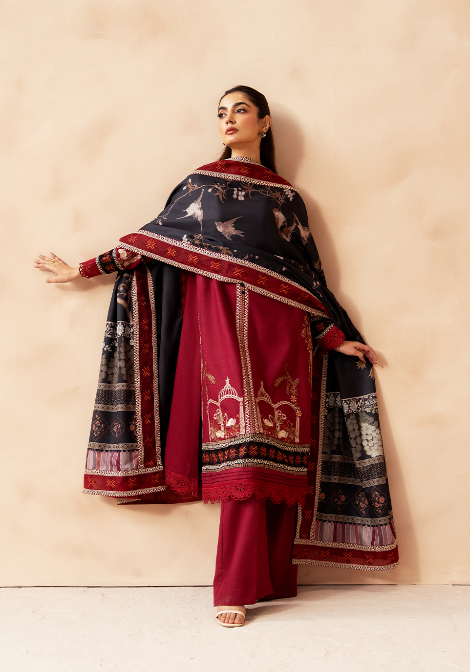 The embroidery unfolds across the deep red silk karandi like quiet artistry, beginning with soft motifs that trace the hem and side panels in gentle rhythm. The silhouette is then defined with a striking flourish, a bold black phulkari border gracing the sleeves and hemline, its geometric threads carving out contrast like ink on velvet. The interplay of dark and crimson feels almost calligraphic, each stitch adding a note of drama to the composition.Delicate cutwork lace softens the edges, allowing light to breathe through the detailing, while the shawl echoes this story with its digital print framed with phulkari embroidery, completing the piece with a poetic balance of colour, craft, and movement.
