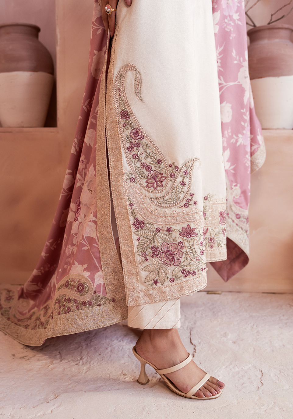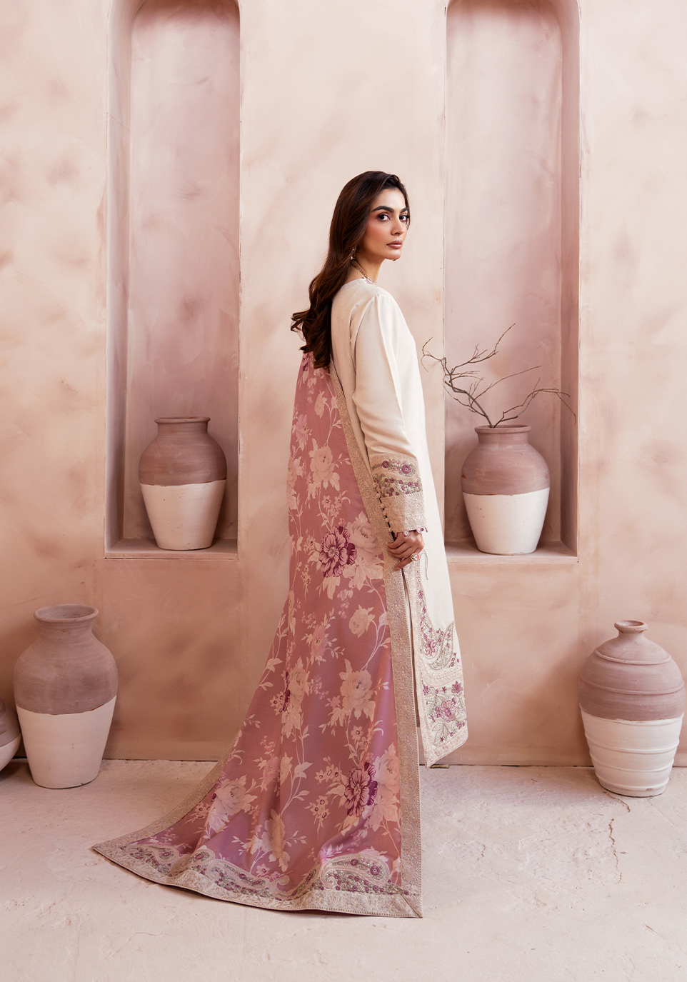 Rendered in soft ivory–beige silk karandi, this ensemble embodies quiet luxury with its fluid drape and winter-weight texture.The shirt features Kashmiri-inspired embroidery, where paisleys and floral elements unfold in blush pink, ivory, and sage. Embroidery frames the neckline, sleeves, and hemline, adding depth while maintaining the outfit’s serene palette.Delicate loop-stitch detailing enhances the silhouette with a refined, handcrafted finish. Paired with tonal pleated pants, the look remains balanced and minimal.A contrasting digital printed shawl, washed in soft florals and bordered with embroidery, completes the outfit with a painterly, heritage-inspired touch.