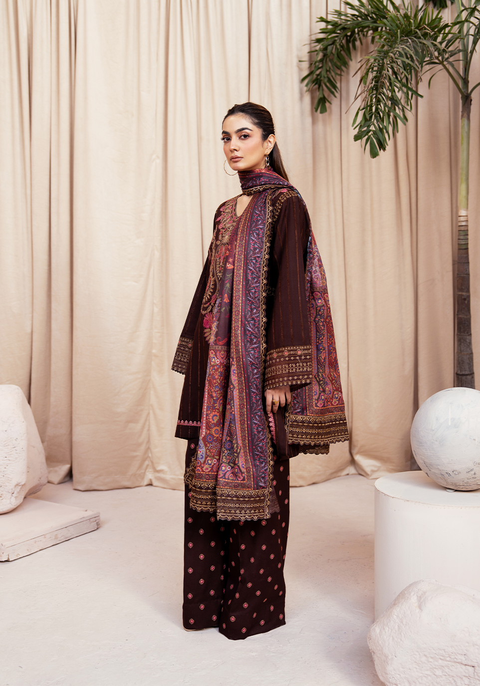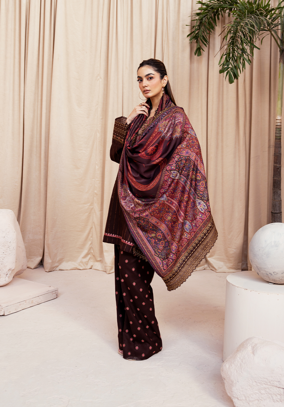 VELVET EMBER is a luxurious deep chocolate velvet-karandi winter suit, crafted for women who love elegant festive fashion. The rich velvet canvas is adorned with Kashmiri-inspired embroidery, framing the neckline with sculpted strokes of burnt orange, fuchsia pink, and soft green. The contrast of colour on the dark base creates controlled vibrancy and an artisanal, statement look.The trousers are detailed with delicate dotted embroidery, adding fine texture and harmony to the silhouette. Completing the ensemble is a kalamkar-inspired digital printed shawl, featuring intricate borders and heritage motifs that introduce movement, pattern, and refined drama.Warm, moody, and impeccably crafted, this three-piece winter outfit combines velvet luxury, artisanal embroidery, and festive charm  perfect for winter dinners, seasonal gatherings, and evening wear.
