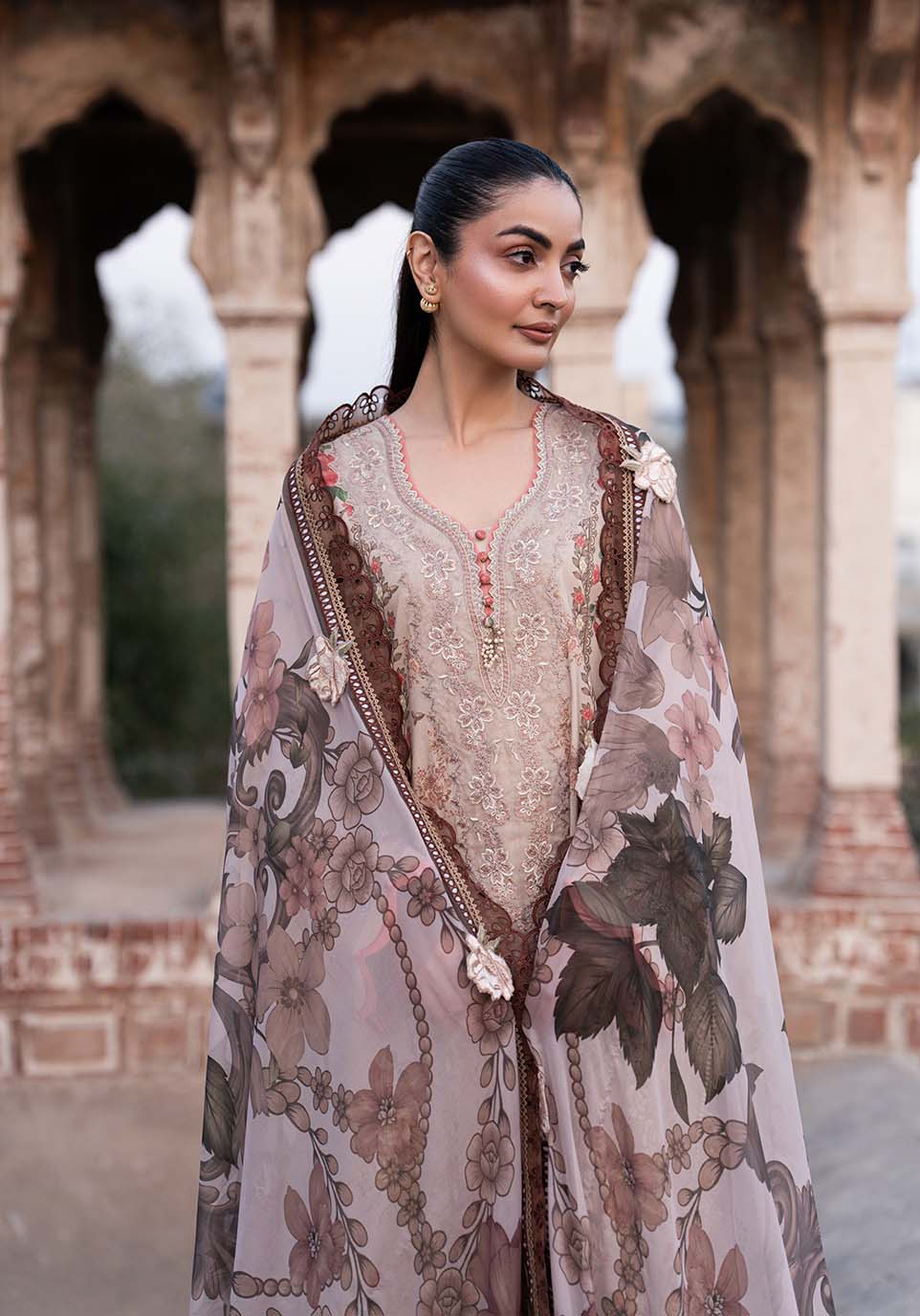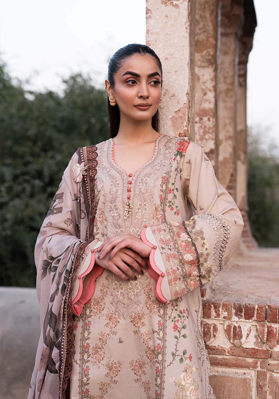 Digitally printed lawn (front, back & sleeves) enriched with embroidered detailing on both corners, statement daman borders, sleeve accents, and intricately finished trouser hems. Paired with printed cotton lawn trousers and a flowing cotton silk dupatta that completes the look with effortless elegance. Crafted for summer festivities